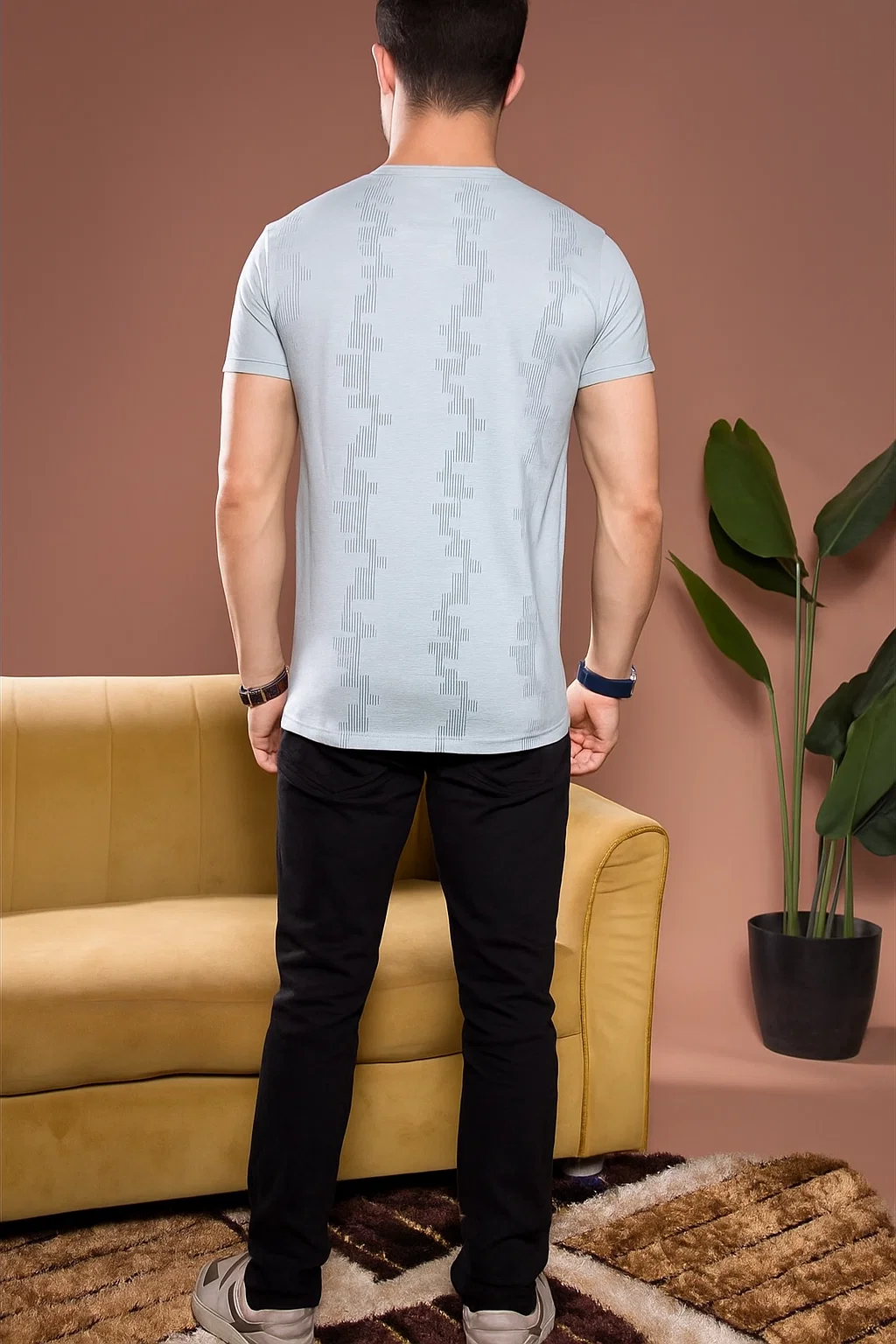 Stay cool and stylish with this sky blue t-shirt made from premium fabric. Its lightly embossed pattern adds a modern twist, making it great for daily wear or casual weekends. Matches well with both light and dark denim.